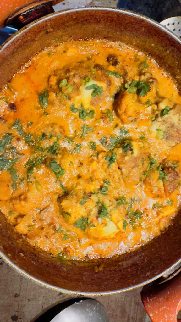 सामग्री :→ ½ kg बड़े गोल आकार के आलू, हरी मटर के दाने 1 कप, हरी धनिया की चटनी 1 बड़ा चम्मच | दही 1 बड़ा कप , पिसा अदरक ½ बड़ा चं, 2 टमाटर कटे हुए , 2 बड़े प्याज पिसे हुए, कश्मीरी लालमिर्च ½ बड़ा चं पिसा, जायफल ¼ टुकड़ा , 1 चम्मच पिसी लालमिर्च, जावित्री 1 छोटा टुकड़ा, हल्दी 1 चं , गर्म मसाला 1 चं पनीर के टुकड़े 1 कप , काजू 20, 2 बड़े चम्मच दूध में पिसे हुए | केसर दूध में घुला हुआ [1 बड़े चं में ] 1 तेजपत्ता , 2 छोटी इलाइची | घी 3 बड़े चं , तलने के लिए तेल , नमक 2 चं |