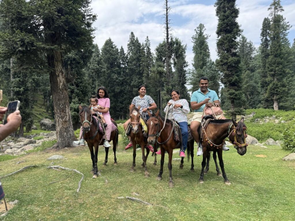जिसकी ऊंचाई 14 हजार feat है। Higher peak पर बर्फ जमी हुई थी उस पर लोग खेल रहें थे। इतनी ऊंचाई पर आकर चारो तरफ पहाड़ो की ख़ूबसूरती देखते ही बनती थी कुछ भी कहो जब बर्फ गिरती होगी और पूरे पहाड़ बर्फ से ढंके होते होंगे। इसकी कल्पना ही रोमांच से भर देती है। यही पर winter-game होते है। 4 घंटे में हम घूमकर वापिस आ गए ।फिर दिनभर पूरा गुलमर्ग घूमा इस बीच बारिश होने से और सुंदर समा बंध गया 🙌 और दिनों में हमने यूनूस मार्ग, दूध-पत्री देखा ।घोड़े पर सवारी की बहुत ही मजा आया ऊँचे – नीचे रास्तो जंगलो से होते हुए सफर किया अलग ही जीवन का अनुभव था।